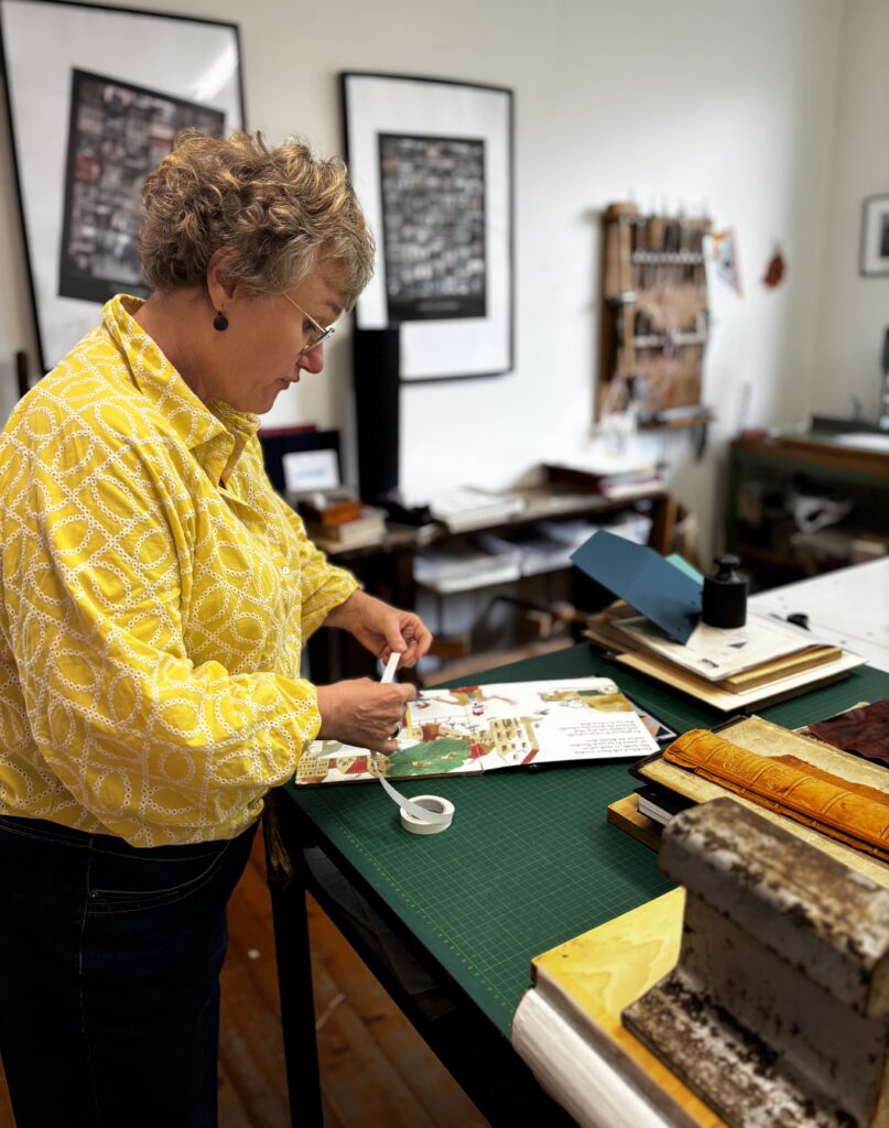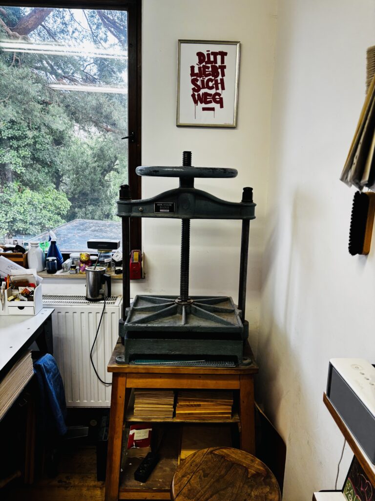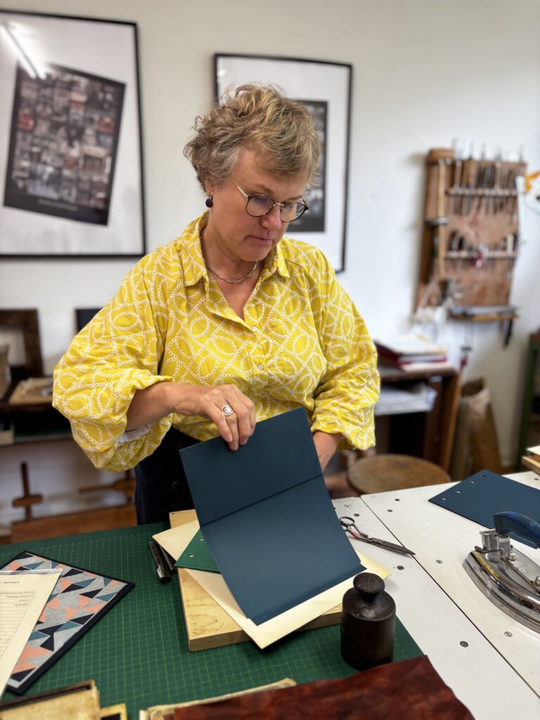 aus Friedrichshagen. Dort finde ich Frauke Grenz in ihrer Papierwerkstatt. Es ist ein besinnlicher, ruhiger Stadtteil im Südosten von Berlin. In einer kleineren Seitenstraße entdeckte ich vor Jahren, bei einem Spaziergang die Papierwerkstatt. Seitdem habe ich mit lehrinhaltlichen Unterstützungen von der Buchbindemeisterin Frauke Grenz einige Schreibbücher, Leporellos und eine Mappe gestaltet und angefertigt. Das Wissenswerte über das Papierhandwerk bereichert die Lehrschritte für die Buchgestaltung.